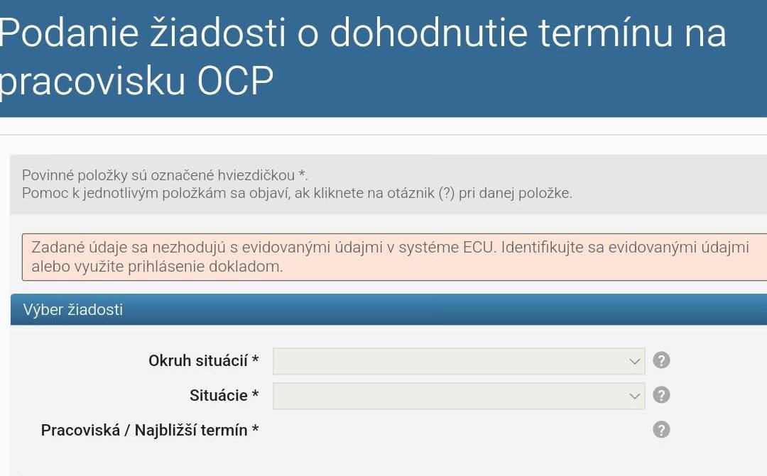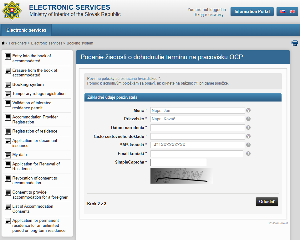 Бронювання здійснюється без авторизації, шляхом введення особистих даних (ім’я, прізвище, дата народження, телефон, email та номер паспорта (закордонний паспорт, якщо це перша реєстрація в Словаччині; ідентифікатор, якщо ви odidenec і хочете отримати пластикову картку). Терміни доступні на 40 днів наперед.