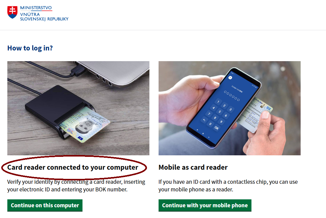 Якщо у вас є карта та BOK-код, спосіб входу на портал залежатиме від її типу. Нові карти з чипом NFC (видаються з 18.10.2023) працюють і з комп’ютером, і з телефоном завдяки бездротовому з’єднанню. Старі ж карти, отримані до цієї дати, підтримують лише кабельне підключення й придатні тільки для роботи на комп’ютері чи ноутбуці