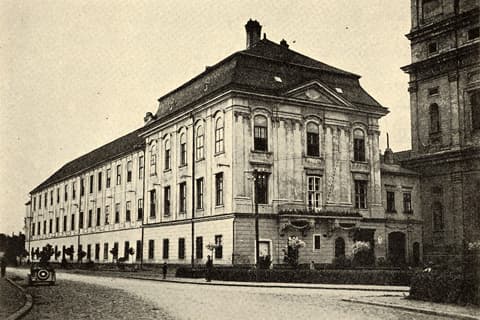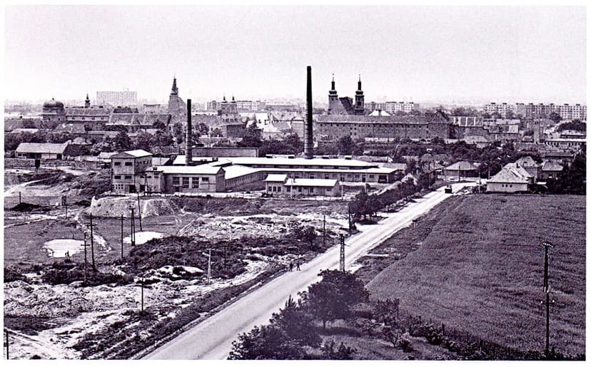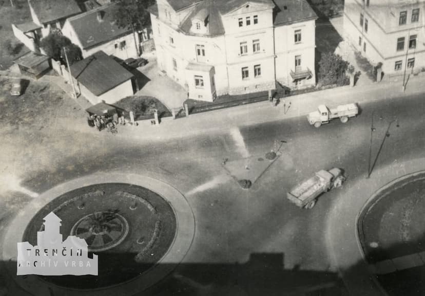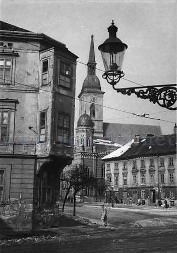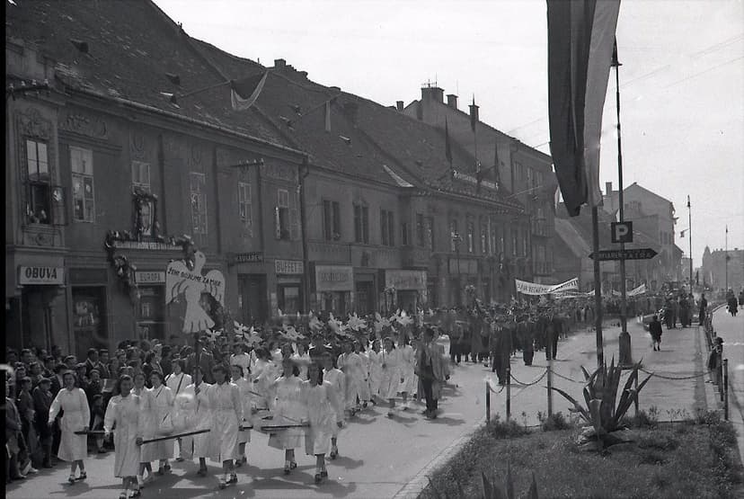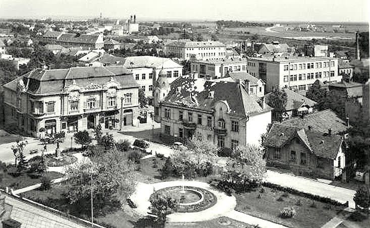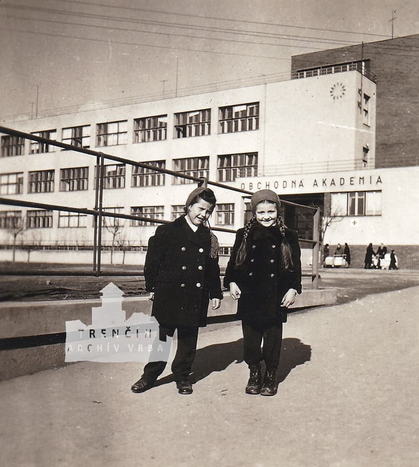 Особенно заметна на снимке здание Obchodnej akadémie — торговой академии, которая готовила молодежь к работе в экономике и торговле. Ее сдержанный фасад и четкие линии хорошо вписываются в общий вид города, а внутри учебный процесс продолжался, готовя студентов к новым вызовам времени.