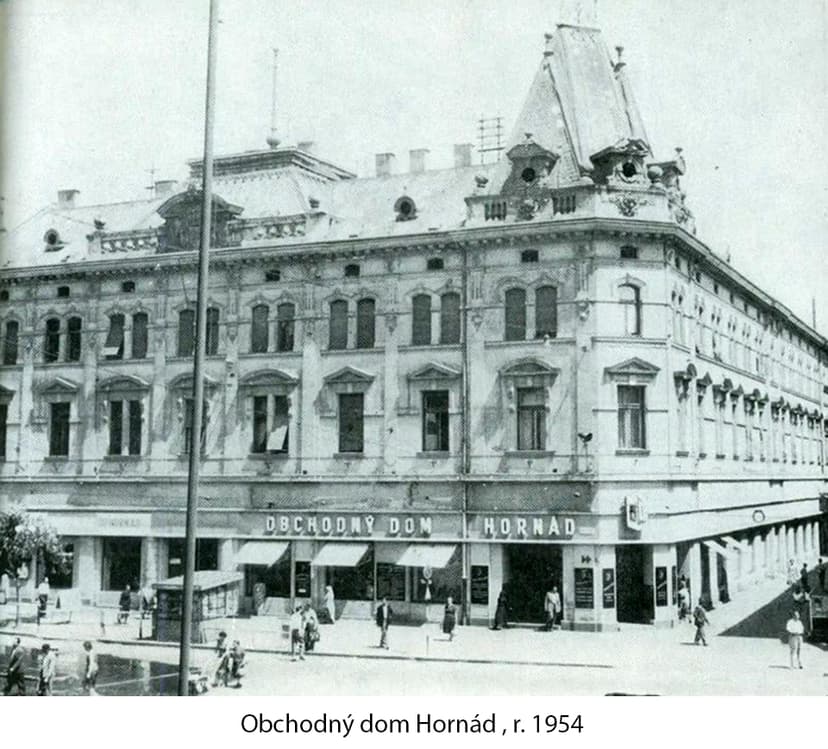 На фото 1954 года — Obchodný dom Hornád, один из знаковых торговых домов своего времени. Он был современным центром торговли и популярным местом для жителей города. В те годы такие дома выполняли не только функцию магазинов, но и были важными социальными пространствами — местами встреч, общения и даже культурных событий. Этот торговый дом ярко отражает атмосферу послевоенного восстановления, когда города начинали возвращаться к нормальной жизни, а улицы оживали после сложных времен.