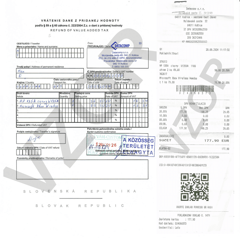 - Минимальный чек: В Словакии — от 100 € на одного человека в одном магазине. Перечень товаров в чеке должен быть для личных нужд и помещаться в багаж.
