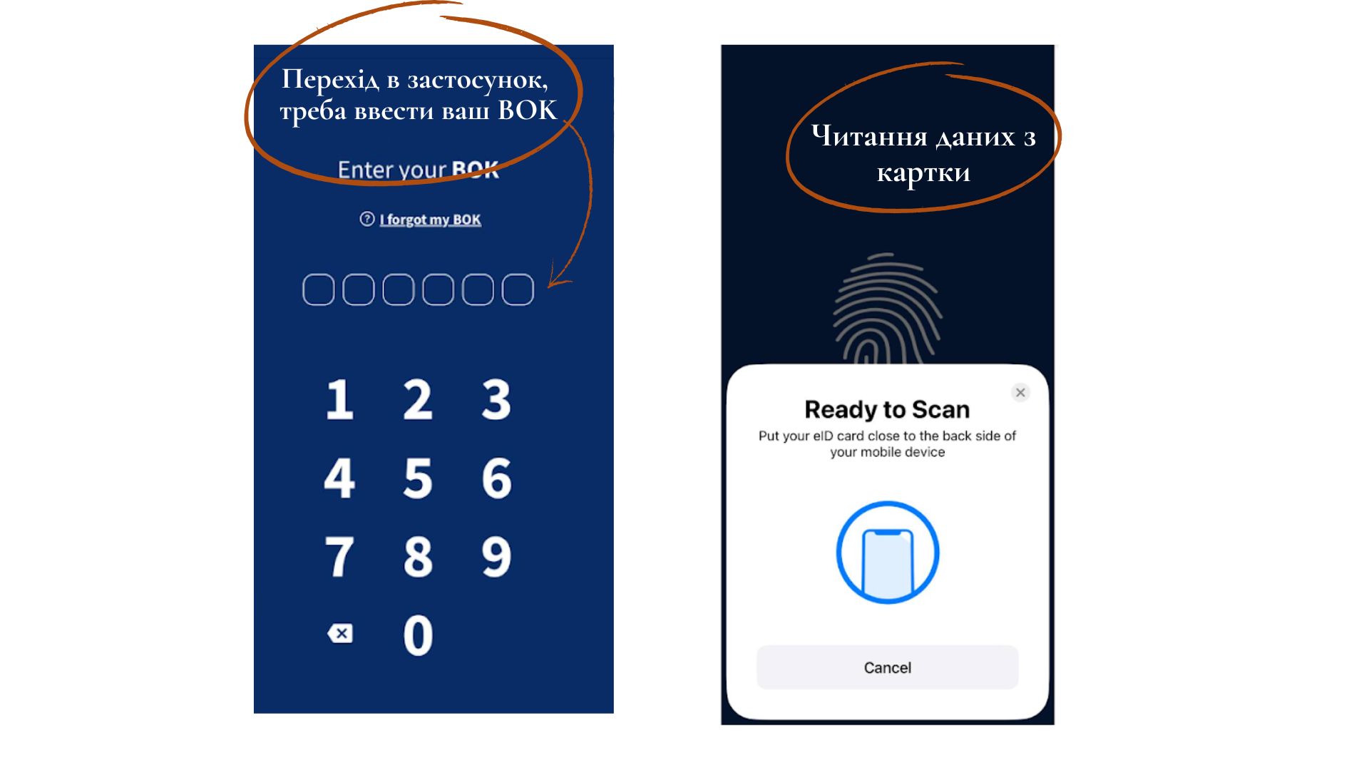 Cистема автоматично відкриє застосунок. На iOS спершу вводиться BOK-код, потім прикладається карта; на Android — навпаки. Важливо правильно прикласти карту до зони NFC