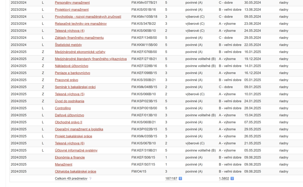 На фото видно, як виглядає університетська система Votr, яку використовують студенти у Словаччині. Тут можна перевіряти свої оцінки, кількість отриманих кредитів (ECTS), дізнатись, скільки балів набрано за кожен предмет і який середній результат по всіх дисциплінах.
