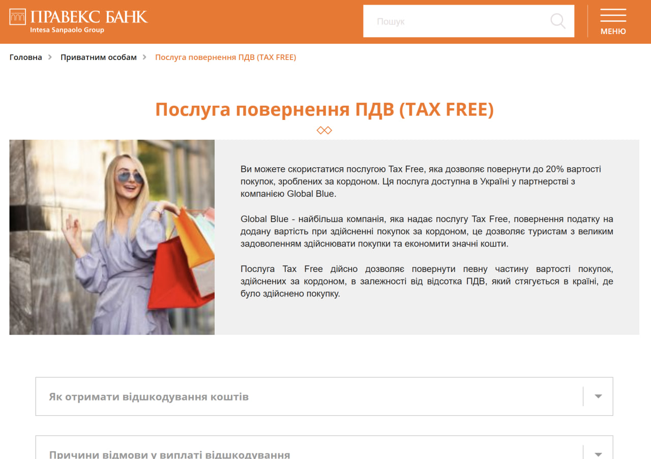 - В Україні через партнера: Компенсацію Tax Free в Україні можна отримати й через партнерські банки, що співпрацюють із міжнародними операторами повернення ПДВ, зокрема Правекс-Банк, який працює з Global Blue. Після проставлення митного штампу мандрівник має звернутися до одного з відділень банку (рекомендовано попередньо зателефонувати для запису). Необхідно надати чек Tax Free, паспорт та форму із покупки з печаткою митниці. Повернення здійснюють готівкою у гривні за внутрішнім курсом банку або на банківську картку протягом приблизно 10–15 днів.