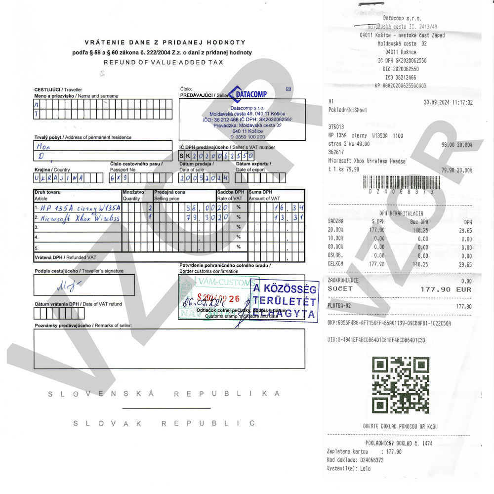 - Мінімальний чек: У Словаччині — від 100 € на одну особу в одному магазині. Перелік товарів на чеку повинен бути для особистих потреб і вміщуватися в багажі.