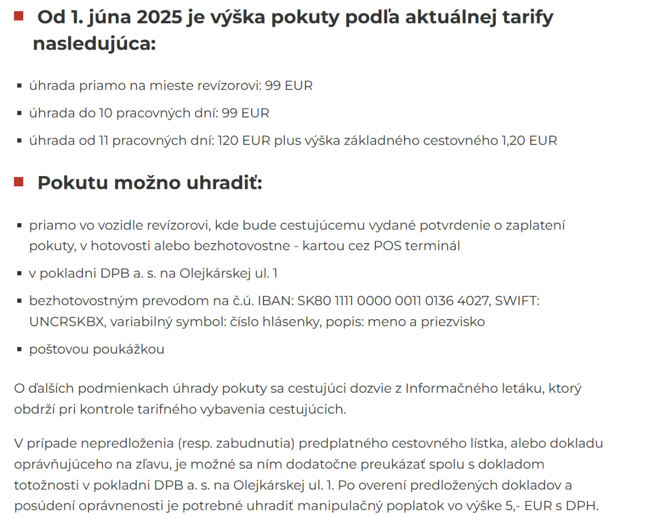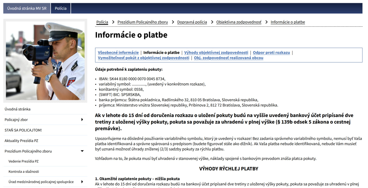 - банківським переказом — на рахунок IBAN: SK80 1111 0000 0011 0136 4027, SWIFT: UNCRSKBX, змінна символіка (VS): номер hlásenky (номер повідомлення про штраф);