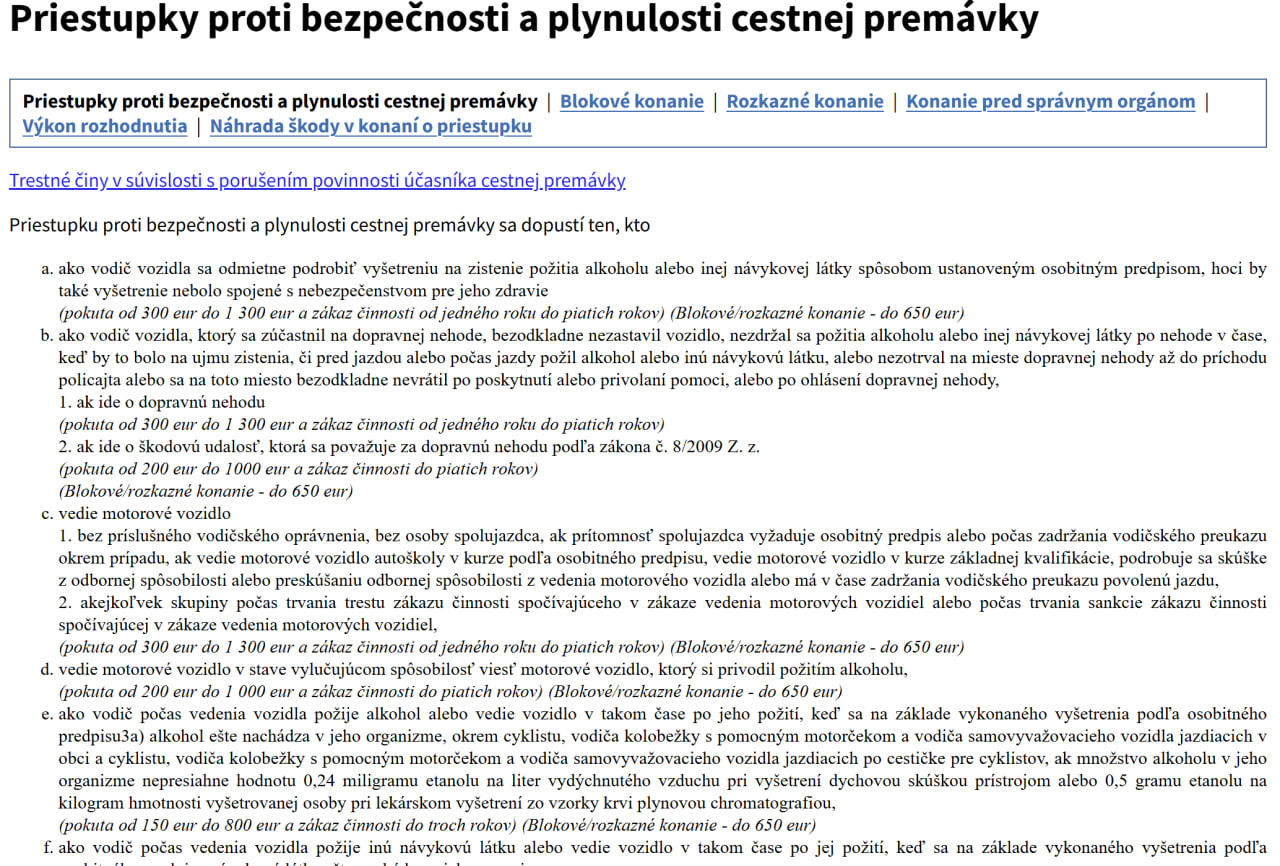 У Словаччині порушення правил дорожнього руху класифікуються так:- Штрафи на місці (pokuta na mieste) — це ситуація, коли поліція може виписати протокол і вимагати оплату безпосередньо на місці зупинки. Такий штраф сплачується лише офіційно, після оформлення протоколу, який водій має право отримати у паперовому вигляді. Оплата без квитанції або будь-яких документів не вважається офіційною і може бути розцінена як хабар. Головне правило — ніколи не давайте гроші «під столом», навіть якщо сума здається незначною. Це порушення закону, за яке передбачена кримінальна відповідальність як для водія, так і для поліцейського.