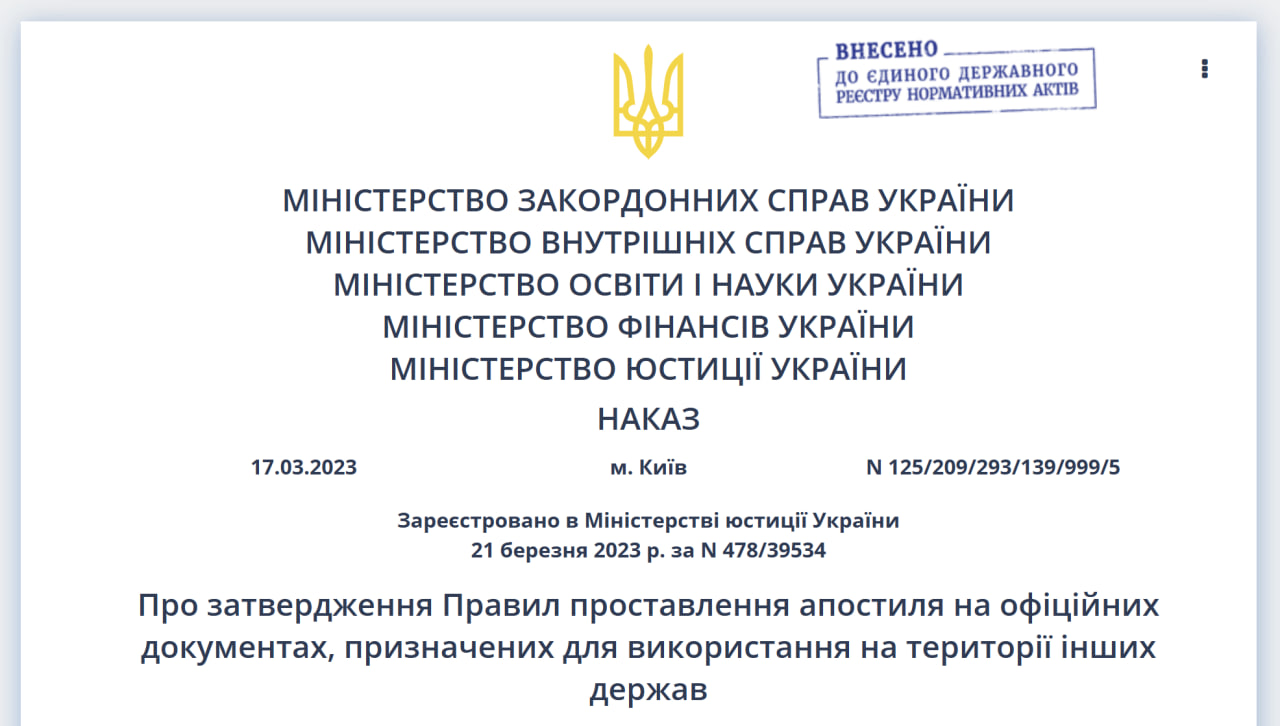 В Україні порядок проставлення апостиля затверджено спільним наказом №125/209/293/139/999/5 від 17.03.2023 (зі змінами від 06.05.2025).