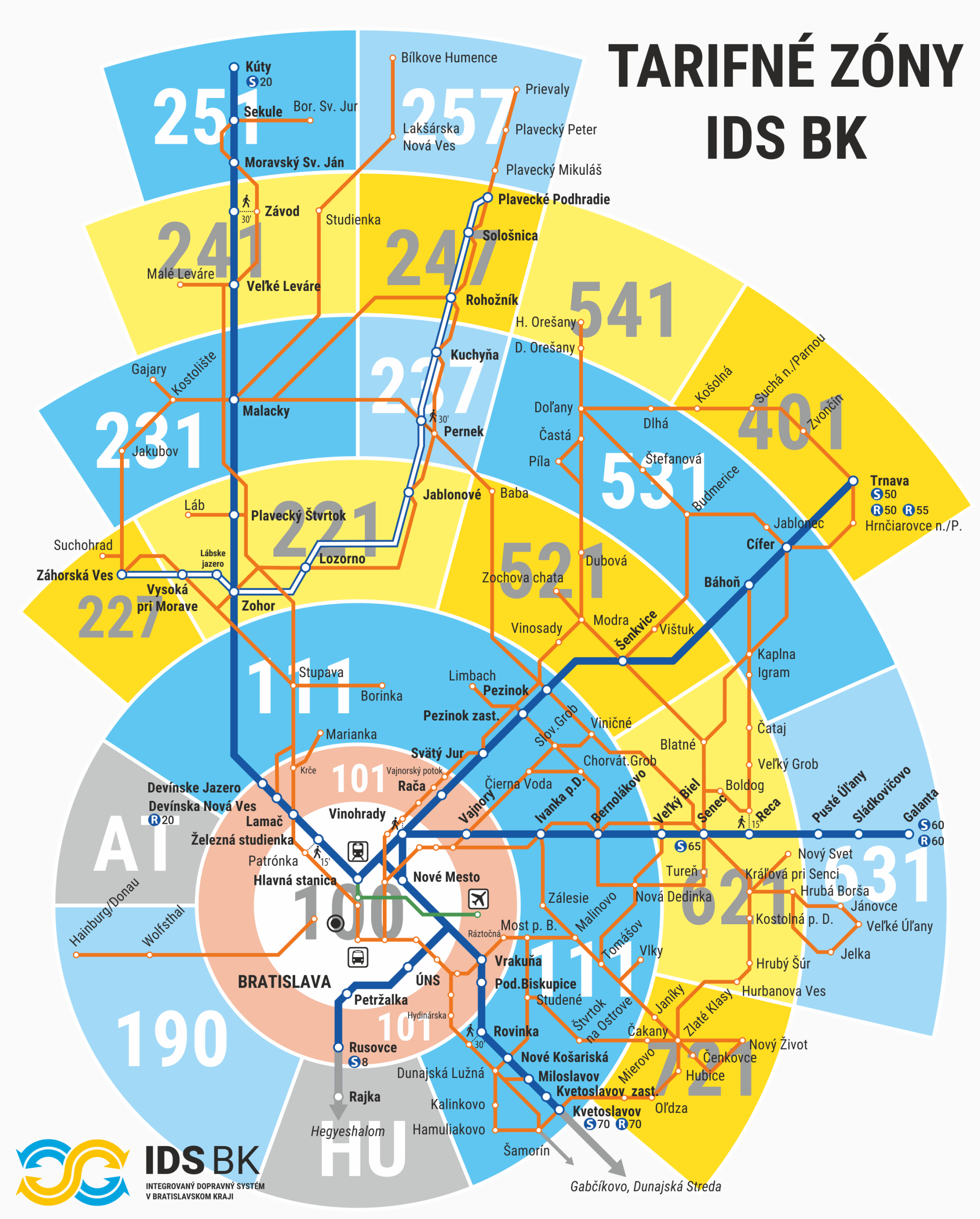 У Братиславі та її околицях транспортна система поділена на зони. Кожна зона має свій номер, і ці зони визначають, який саме квиток вам потрібен.🔹 Зони 100 і 101 — це вся територія міста Братислави. Якщо ви пересуваєтеся лише в межах міста, достатньо стежити за часовою дією квитка, а не за зонами.